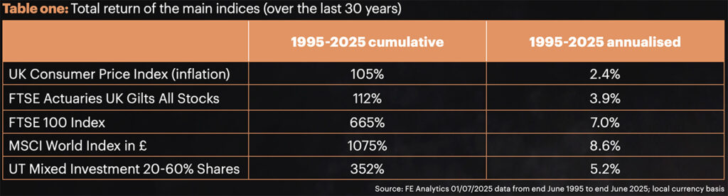 As you can see, equities have done very well over the period but even well-diversified portfolios such as those in the 20-60% Shares sector have returned over three times the level of inflation over the thirty years.