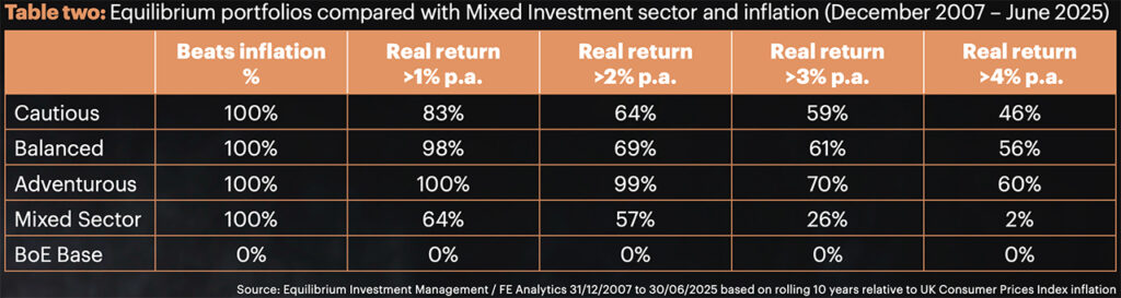 Table two summarises how our portfolios and the Mixed Investment sector have done over 91 x 10-year periods against different levels of inflation.