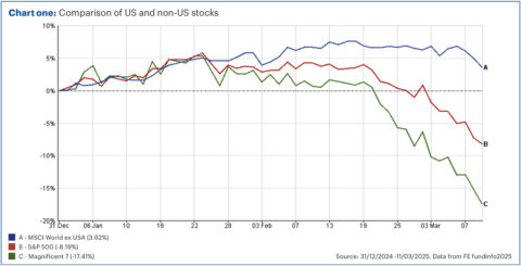 Indeed, we’ve seen the dollar fall by 5.37% against the Euro and 3.37% against the pound since the start of 2025 (Source: FE Analytics to 11 March 2025).