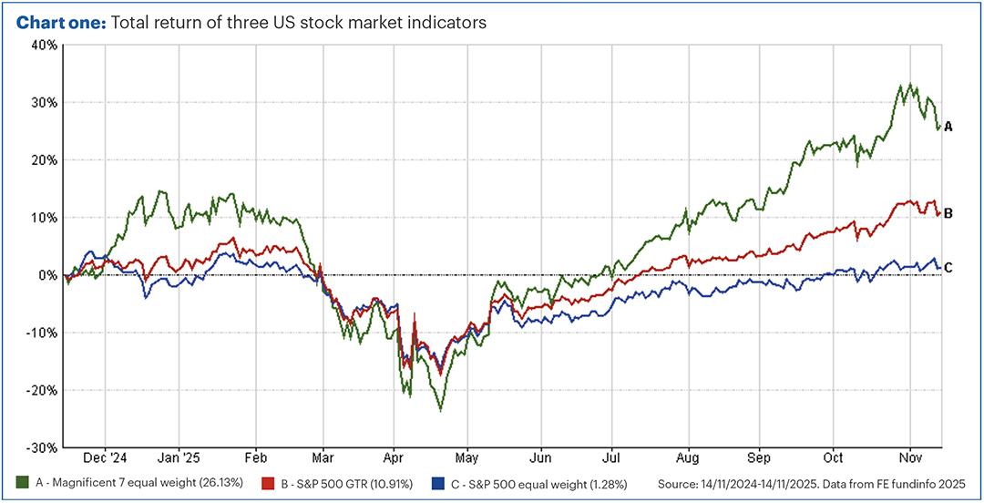 The green line is the so-called “Magnificent Seven” big tech stocks (an equal weight portfolio of Amazon, Apple, Alphabet, Meta, Microsoft, Nvidia, Tesla). This is up 28% over the same period.