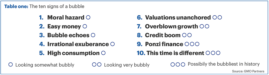 According to Edward Chancellor (who has written books on financial speculation) of GMO Partners, there are ten signs that a bubble might be breaking out. Table one shows GMO’s current assessment of each: